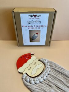 Ils pourront personnaliser deux adorables Père Noël en bois grâce aux peintures, aux strass décoratifs, et au fil de macramé en coton recyclé (marque française) permettant de créer une grande barbe douce et volumineuse.
